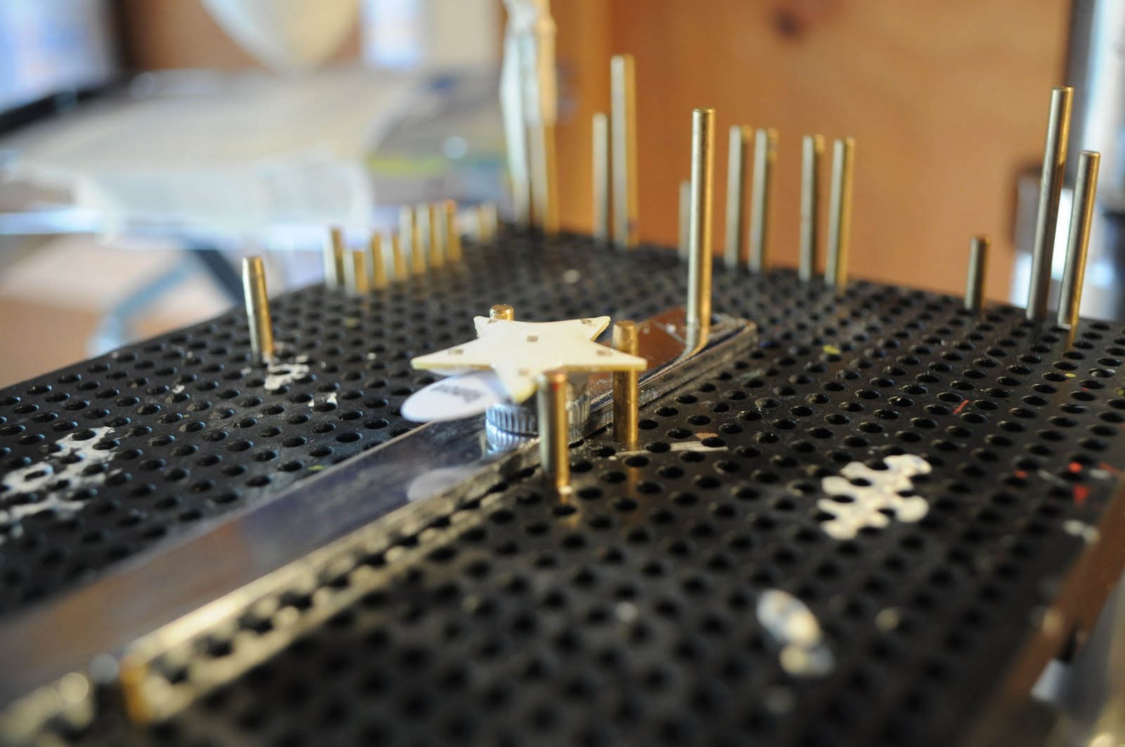 I use a pin table, which allows me to position metal pins to create a custom holder for whatever I'am printing, Because these pins are magnetic, I use the metal bar to help hold the pen in place.